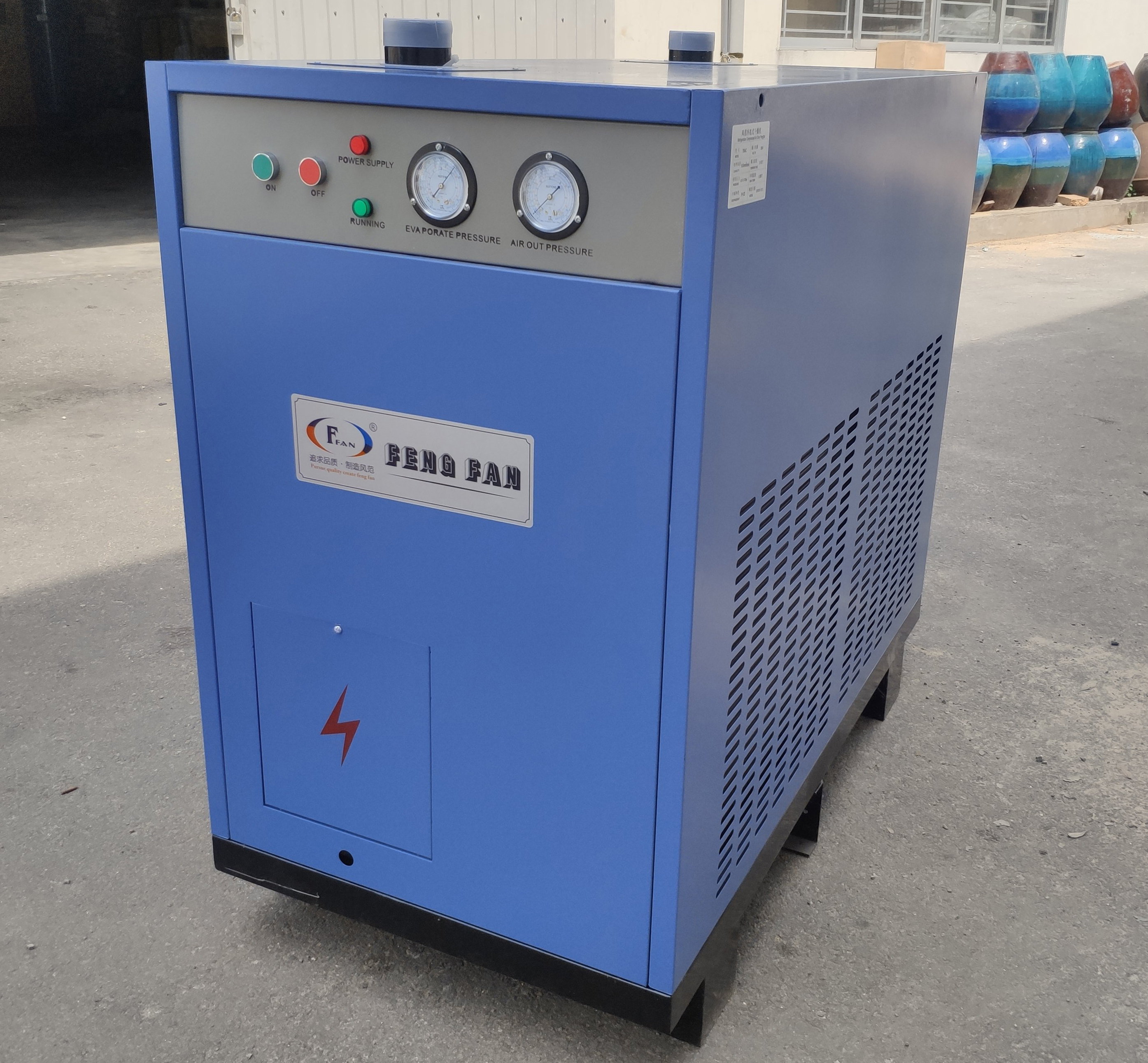- Máy sấy khí tác nhân lạnh Feng Fan được thiết kế trang nhã, vỏ ngoài bằng thép tấm sơn tĩnh điện gỉ sét.